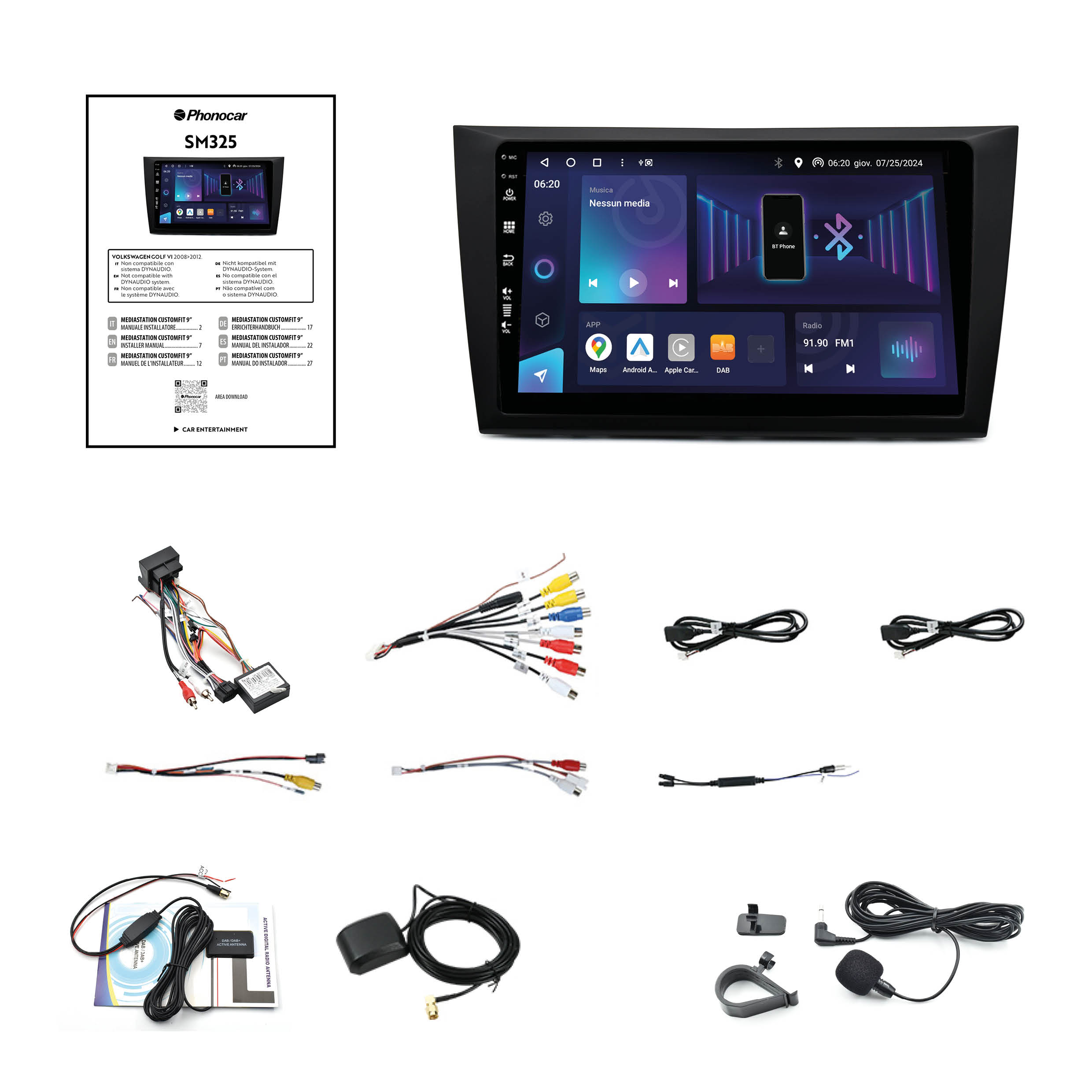 Integrazione CAN-BUS e Audio Digitale La SM325 non è una semplice autoradio, ma un sistema che dialoga con l’elettronica Volkswagen. Garantisce il recupero dei comandi al volante e visualizza le informazioni originali del veicolo. Il ricevitore SUPER DAB+ integrato (antenna inclusa) offre una ricezione radio pulita e cristallina, personalizzabile grazie al potente DSP con equalizzatore a 64 bande.