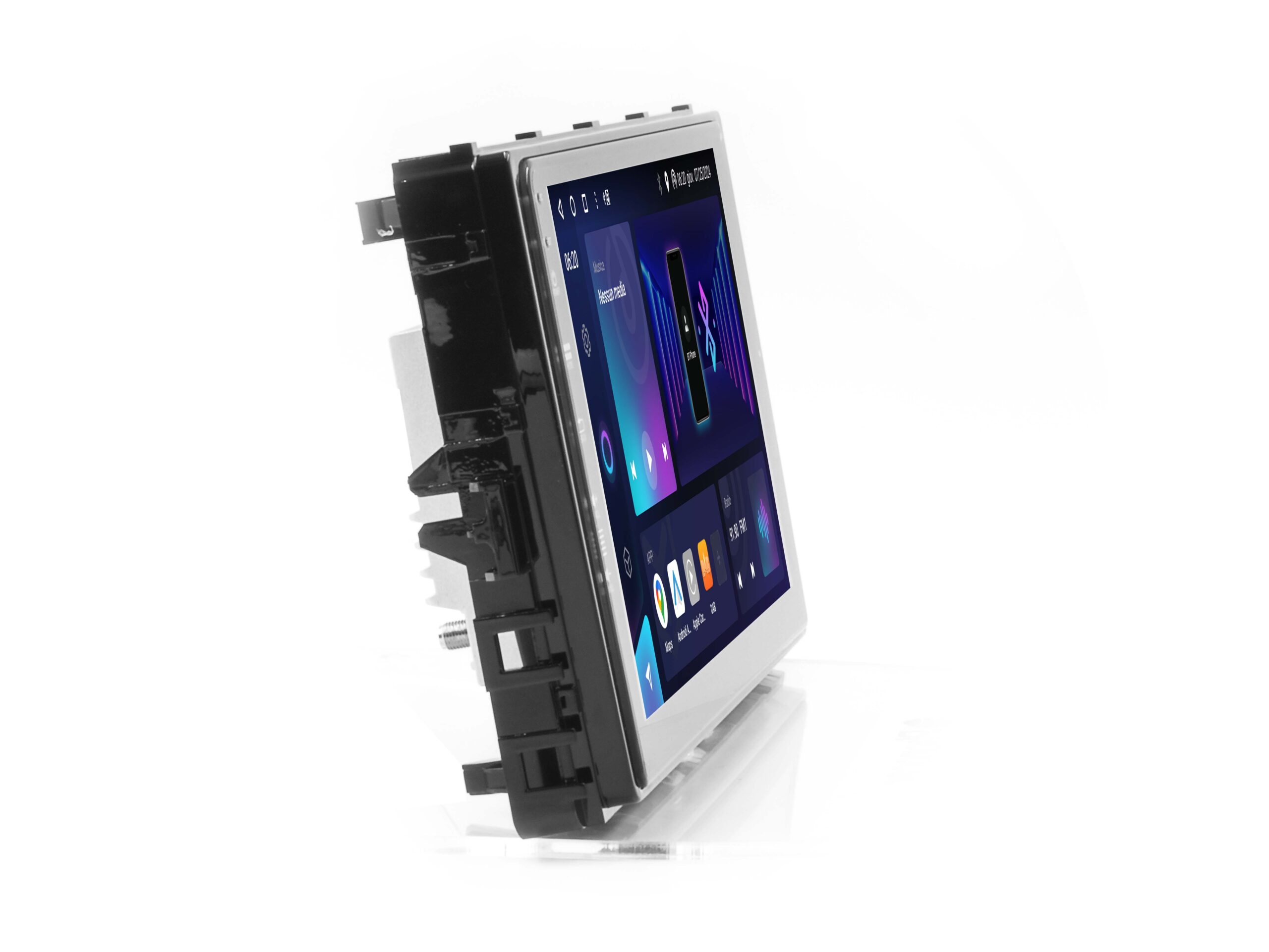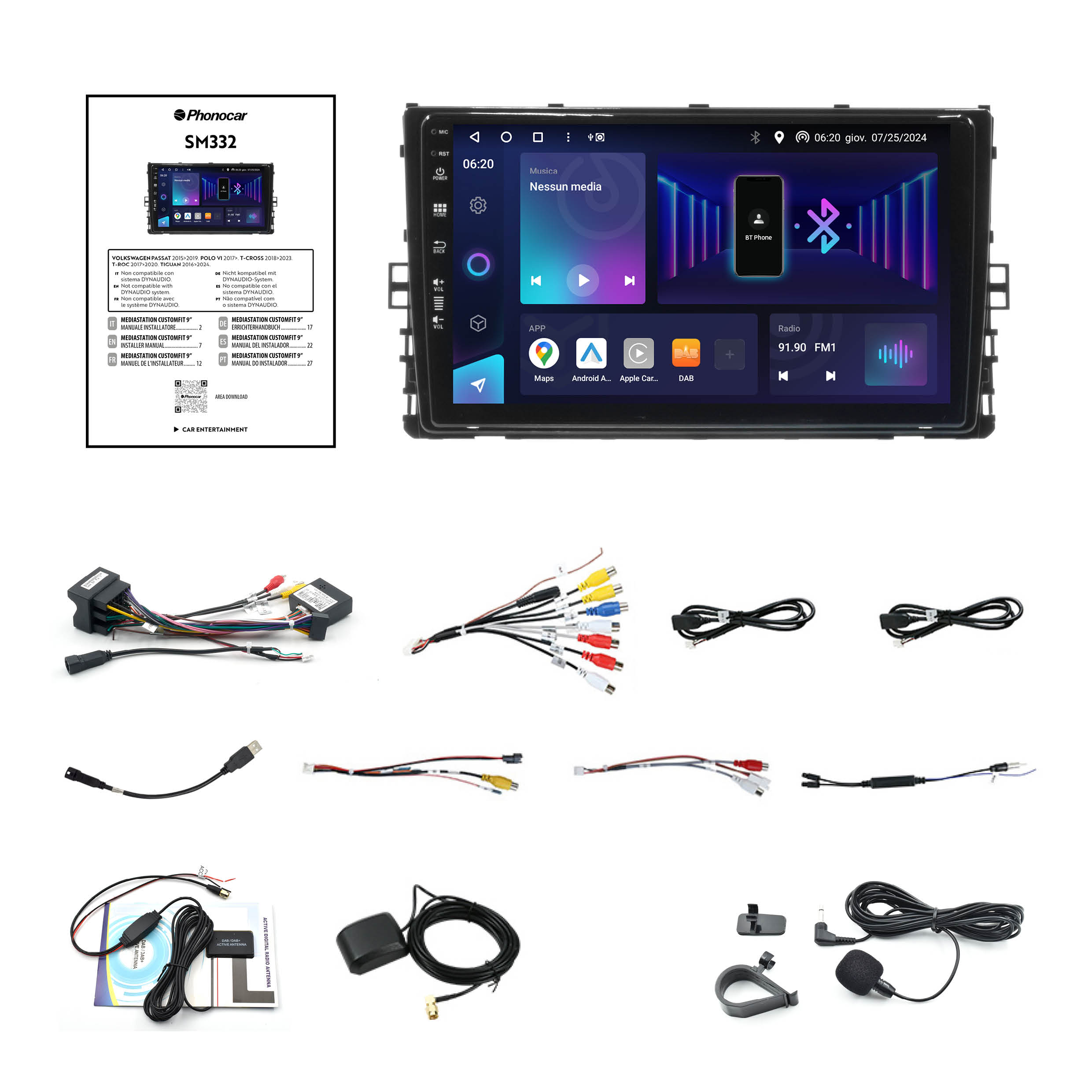 Audio Digitale e Integrazione Totale Ascolta la radio con qualità CD grazie al ricevitore SUPER DAB+ integrato (antenna inclusa). Per gli amanti della personalizzazione sonora, il potente DSP con equalizzatore a 64 bande permette di calibrare il suono con precisione millimetrica. Il sistema garantisce inoltre il recupero dei comandi al volante e si interfaccia con i sistemi di bordo originali per un’installazione pulita e professionale.
