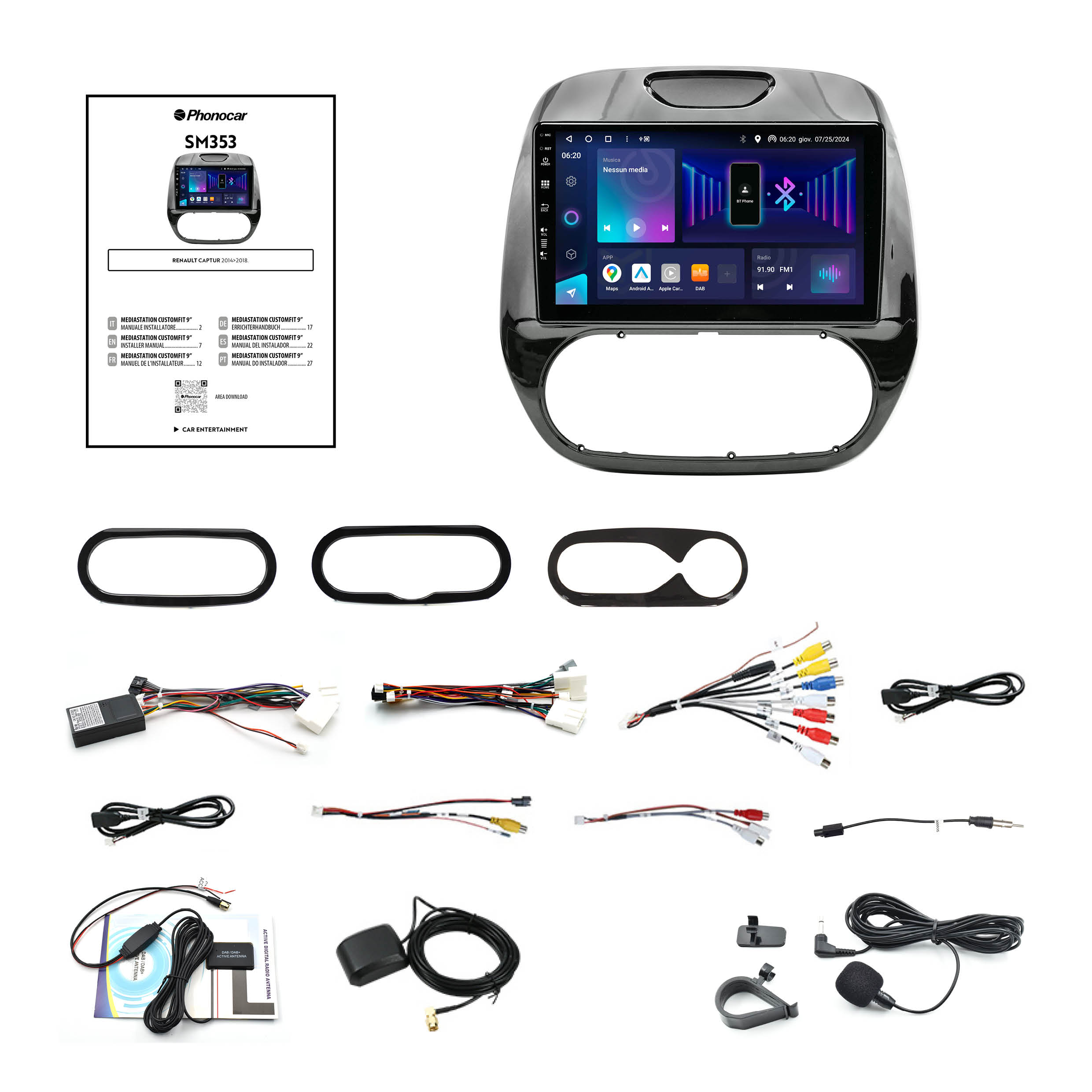 Audio Digitale e Integrazione Can-Bus La qualità audio è garantita dal ricevitore SUPER DAB+ integrato, che offre una ricezione radio pulita e senza interferenze. L’integrazione con la vettura è totale: la SM353 è progettata per il recupero dei comandi al volante e per interfacciarsi con i sistemi di bordo originali, mantenendo intatte le funzionalità di comfort e sicurezza della tua Renault.